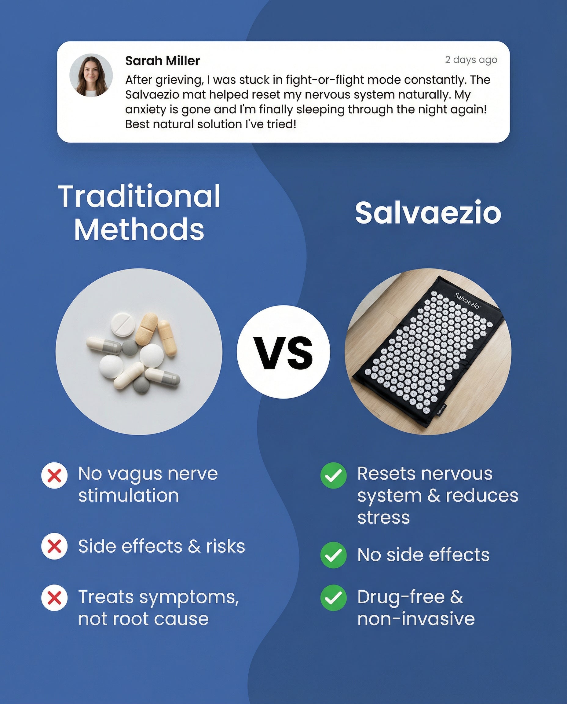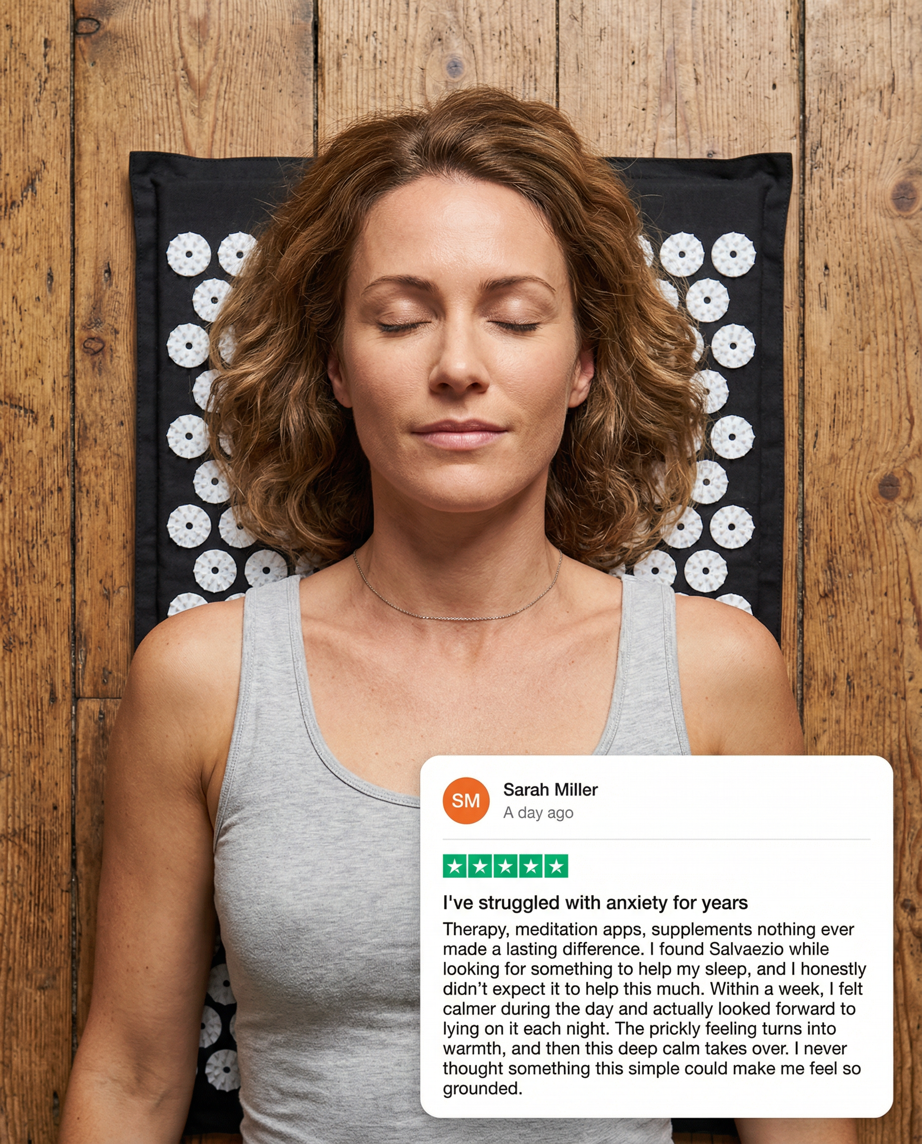 SalvaezioMat uses 8,000+ acupressure points to gently guide your body from stress mode into calm. It helps you release tension, quiet your thoughts, and finally feel at home in your body again.