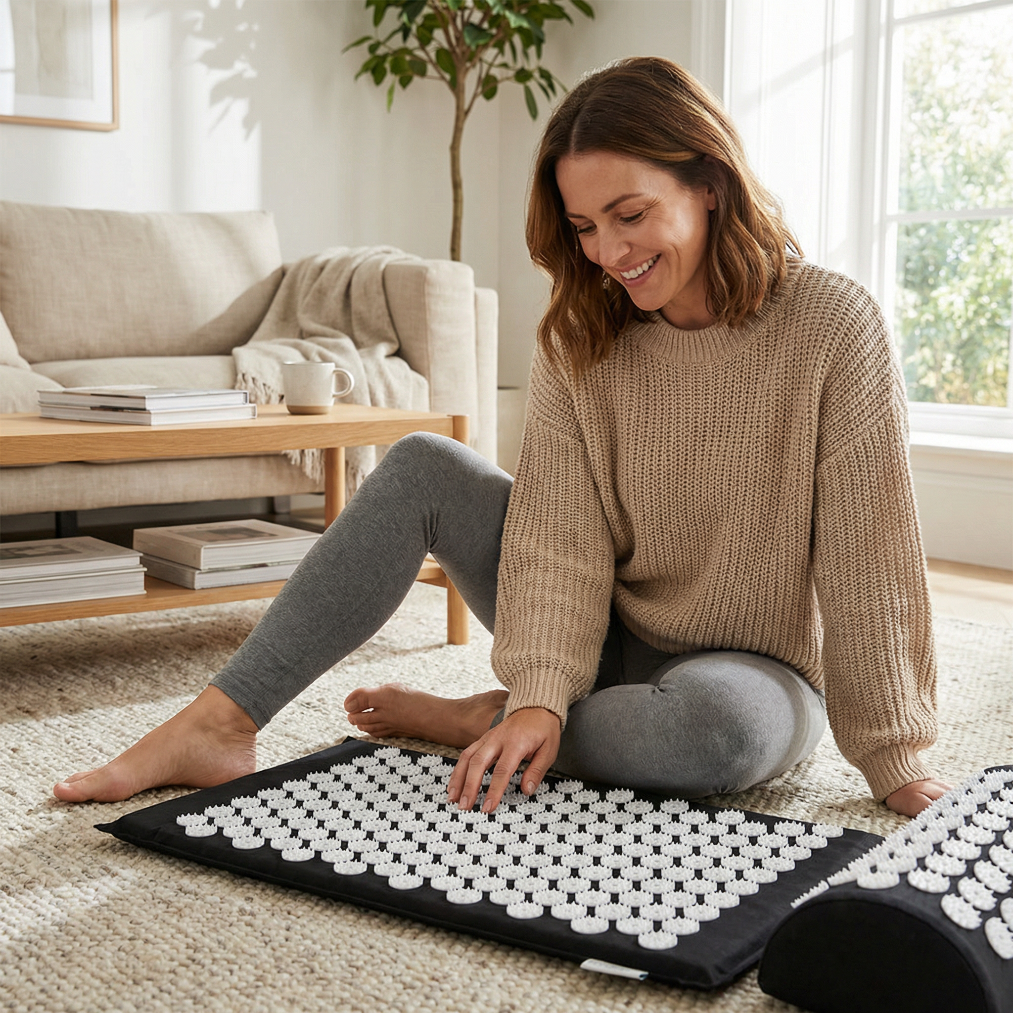 The acupressure mat helps you relax. It does this by stimulating pressure points. This promotes calmness and reduces overstimulation.